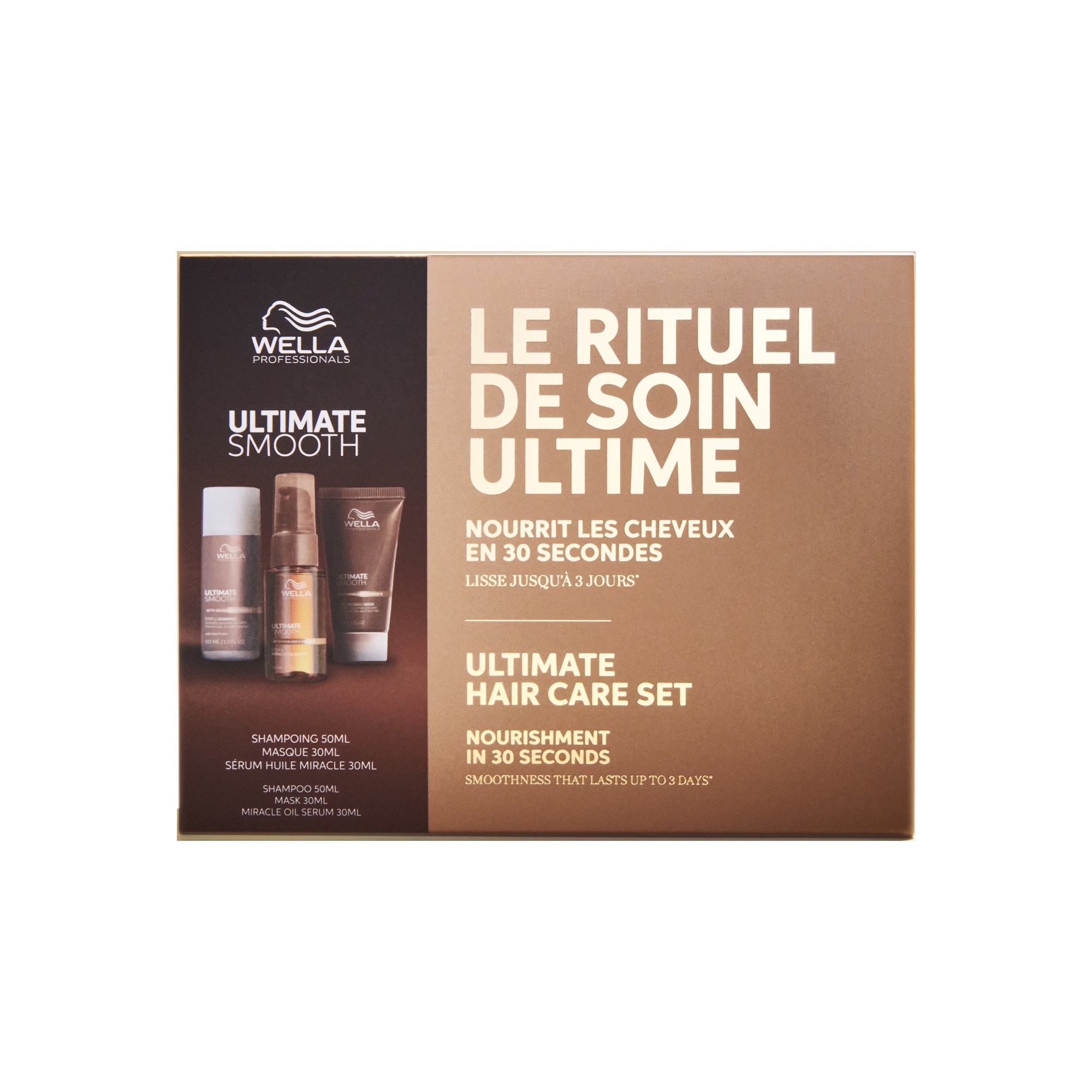 En utilisant la routine complète en 3 étapes, vos cheveux seront nourris et lissés après une seule utilisation pour un contrôle des frisottis jusqu'à 96 heures* . Le coffret est composé de :