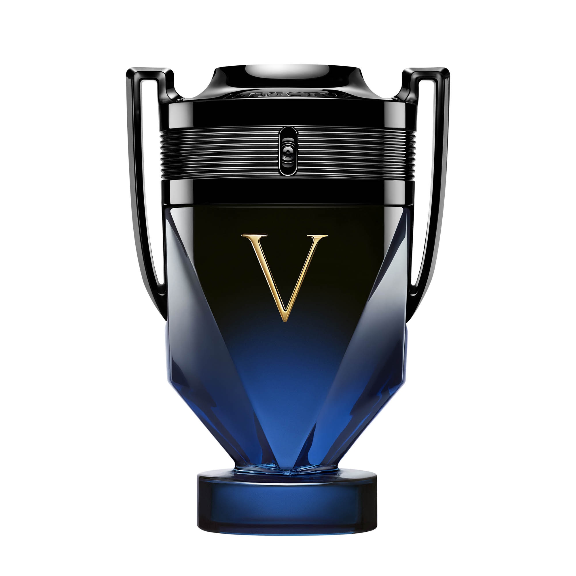 Contenu dans son flacon emblématique en forme de trophée, le parfum Invictus Victory Elixir de Paco Rabanne s'enveloppe d'une laque dégradée de noir et de bleu profond. Surmonté d'un V doré, son capot noir brillant symbolise le triomphe absolu.