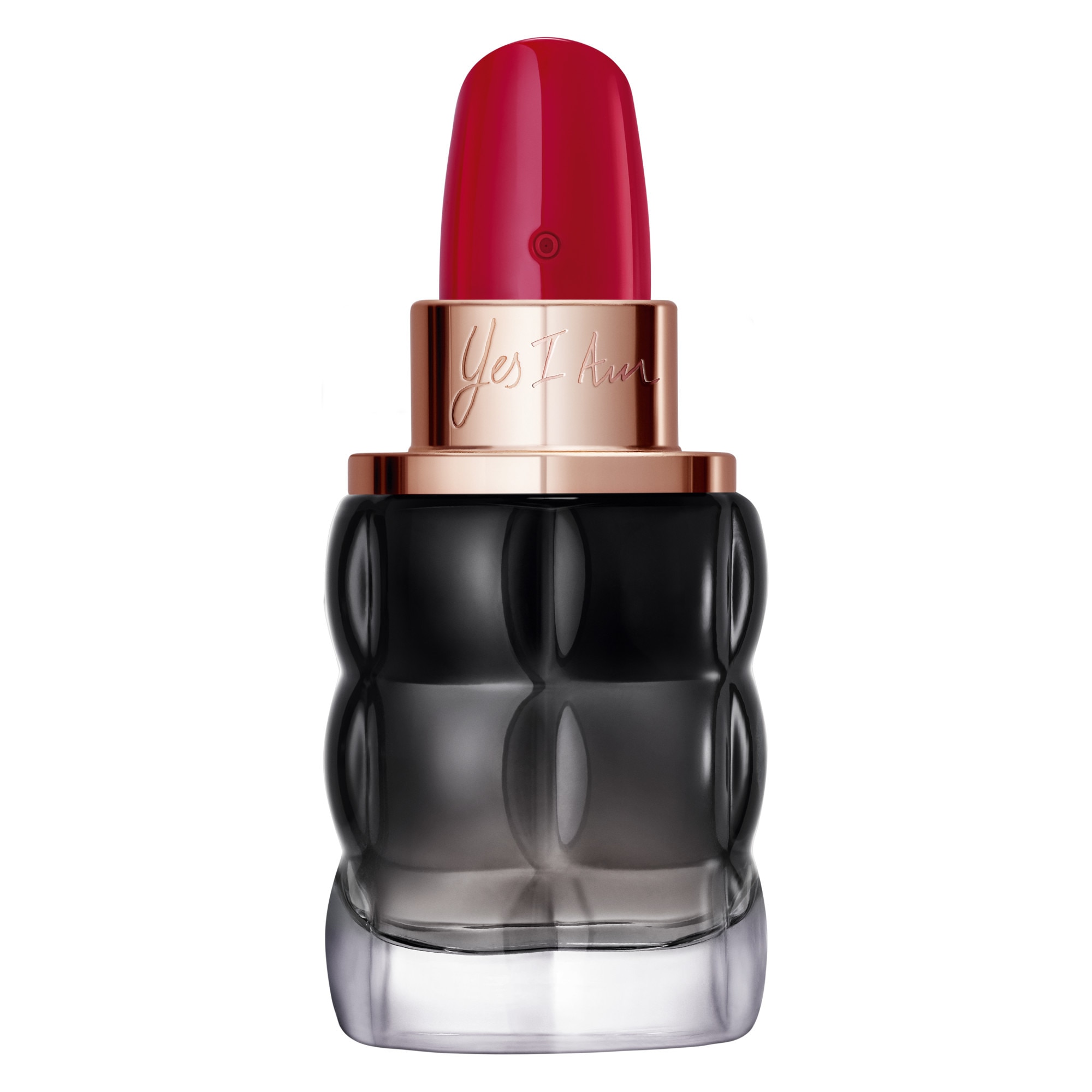 Yes I Am s'inspire du design d'un rouge à lèvres, l'objet indispensable des femmes d'aujourd'hui, pour créer un un flacon audacieux, symbole d'émancipation. Son cabochon rouge vif imite un raisin de rouge à lèvres, gravé du C de Cacharel. Sur le collet couleur or pâle, le nom est inscrit, tel un manifeste : YES I AM ! La texture matelassée du flacon en verre fumé contraste avec l'éclat rouge et or du capot.