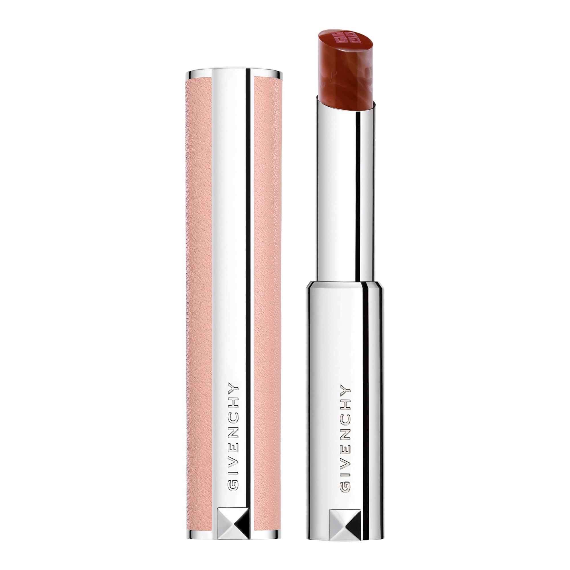 Disponible en dix teintes brillantes marbrées iconiques, dont une qui s'adapte au pH de la peau, Rose Perfecto est abrité dans un élégant écrin en cuir rose tendre, véritable accessoire couture Givenchy.