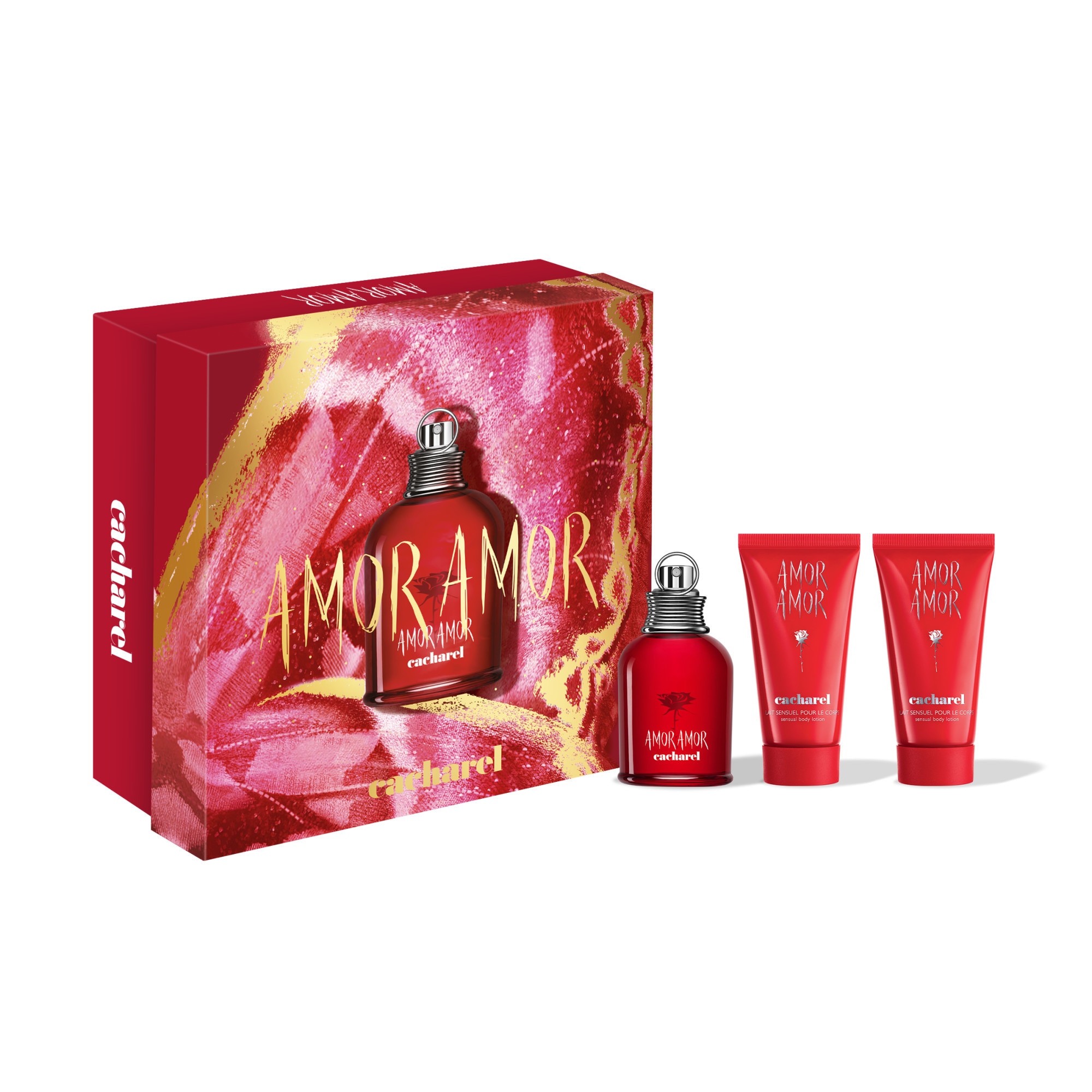 Ce coffret Cacharel contient : - 1 Amor Amor Eau de Toilette 50ml - 2 laits pour le corps 50ml. Amor Amor est le parfum de la passion et du coup de foudre, sensuel et intense, pour un jeu de séduction... Un parfum qui symbolise l'émotion du premier baiser, sensuel et inoubliable. Aux consonances ibériques, Amor Amor sonne comme une déclaration d'amour. Symbolisé par une rose éclatante rouge passion, il raconte l'histoire de la vie ou l'histoire d'un soir. Parfum des amoureux, Amor Amor nous rappelle que l'odorat est le sens essentiel de la sensualité. Comme un philtre d'amour, la composition se colore d'un rouge vibrant et réunit les notes magiques de fleurs et de fruits ainsi que le cassis et l'orange sanguine. Le flacon d'Amor Amor est un concentré d'envie, c'est une petite grenade que l'on dégoupille pour faire exploser le grand amour.