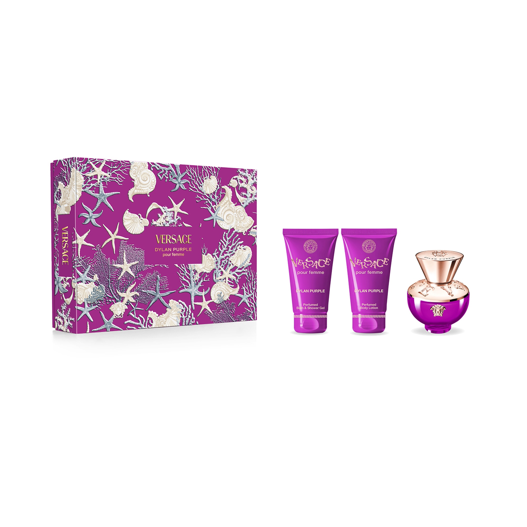 Ce coffret VERSACE contient une Eau de Parfum Dylan Purple 50ml, un gel douche et un lait pour le corps 50ml.