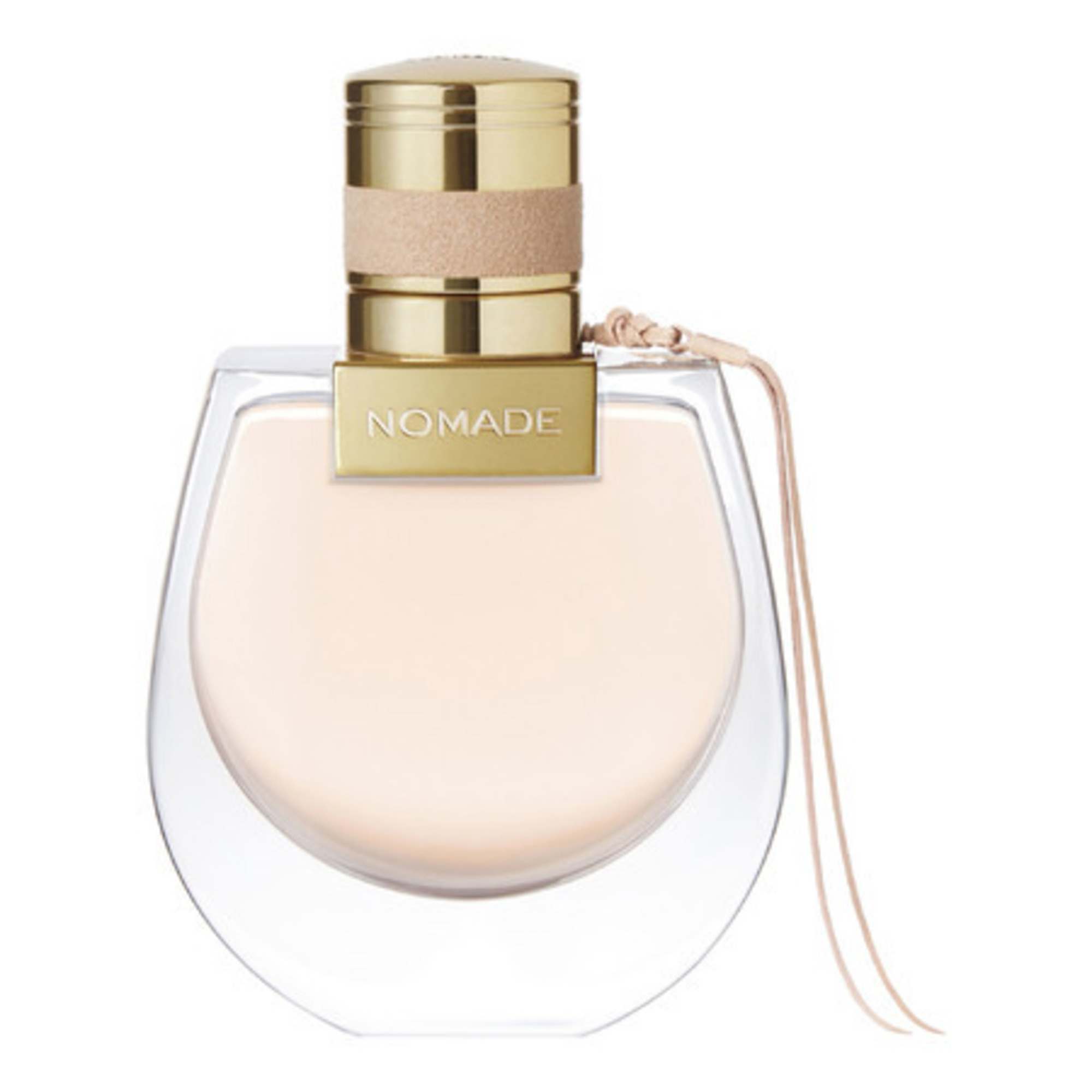 Le flacon Nomade évoque l'évasion, avec des transparences laissant filtrer une lumière beige rosée. Des courbes rondes féminines et un cabochon aux reflets éclatant orné d'un délicat lien de suédine rose.
