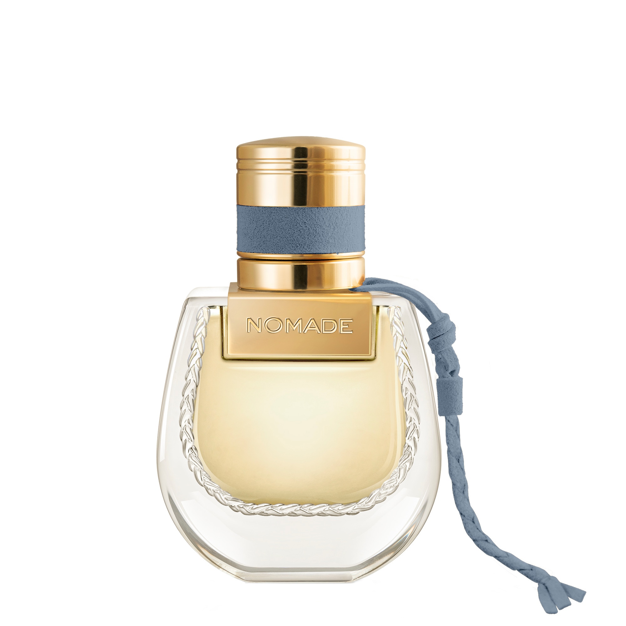 L'emblématique flacon Nomade est rehaussé de touches dorées, tandis que son n?ud se réinvente dans une teinte bleu gris.