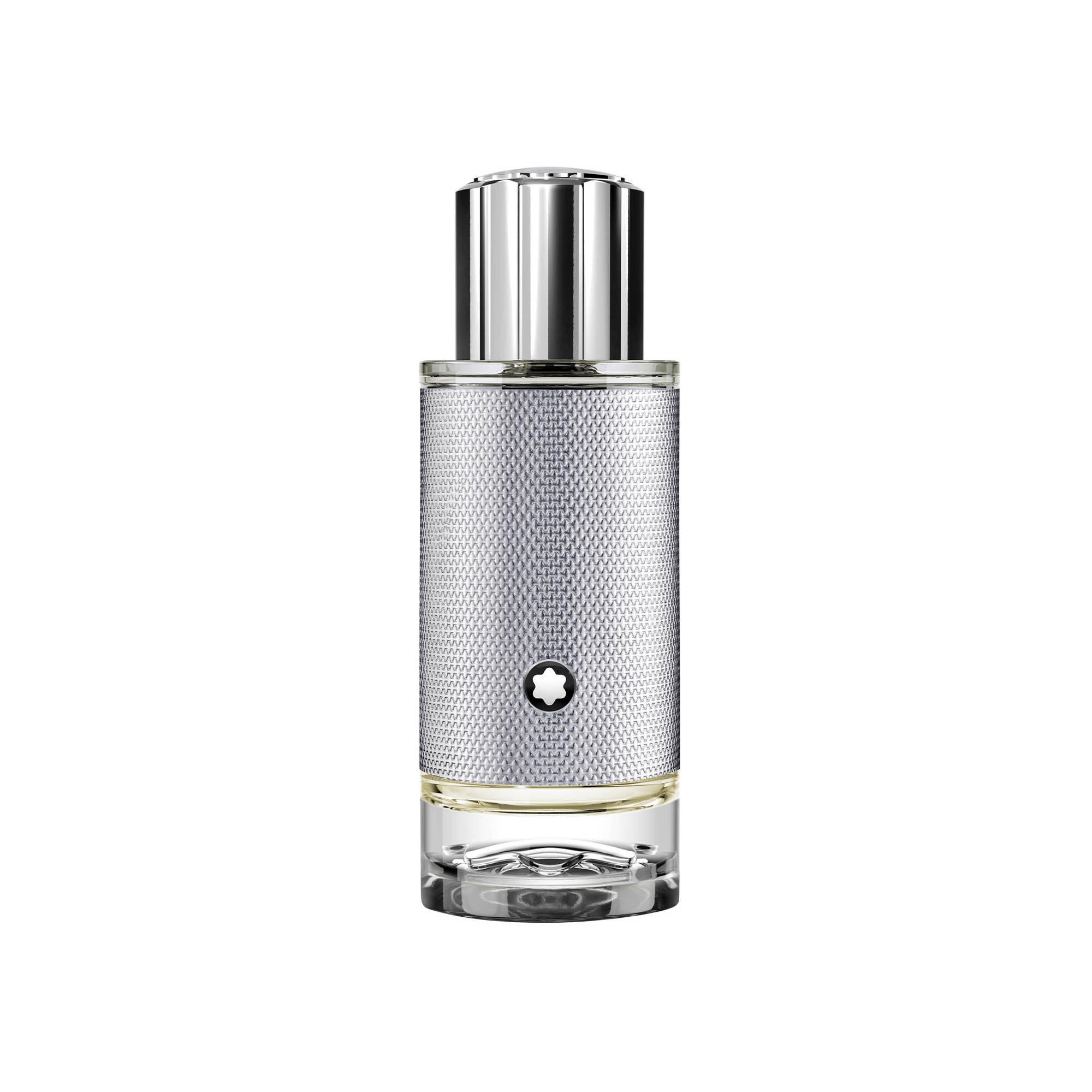 Hommage au défi d'alpinisme des Sept sommets, la montre Montblanc 1858 Géosphère signature a inspiré le fourreau argenté et texturé du flacon.