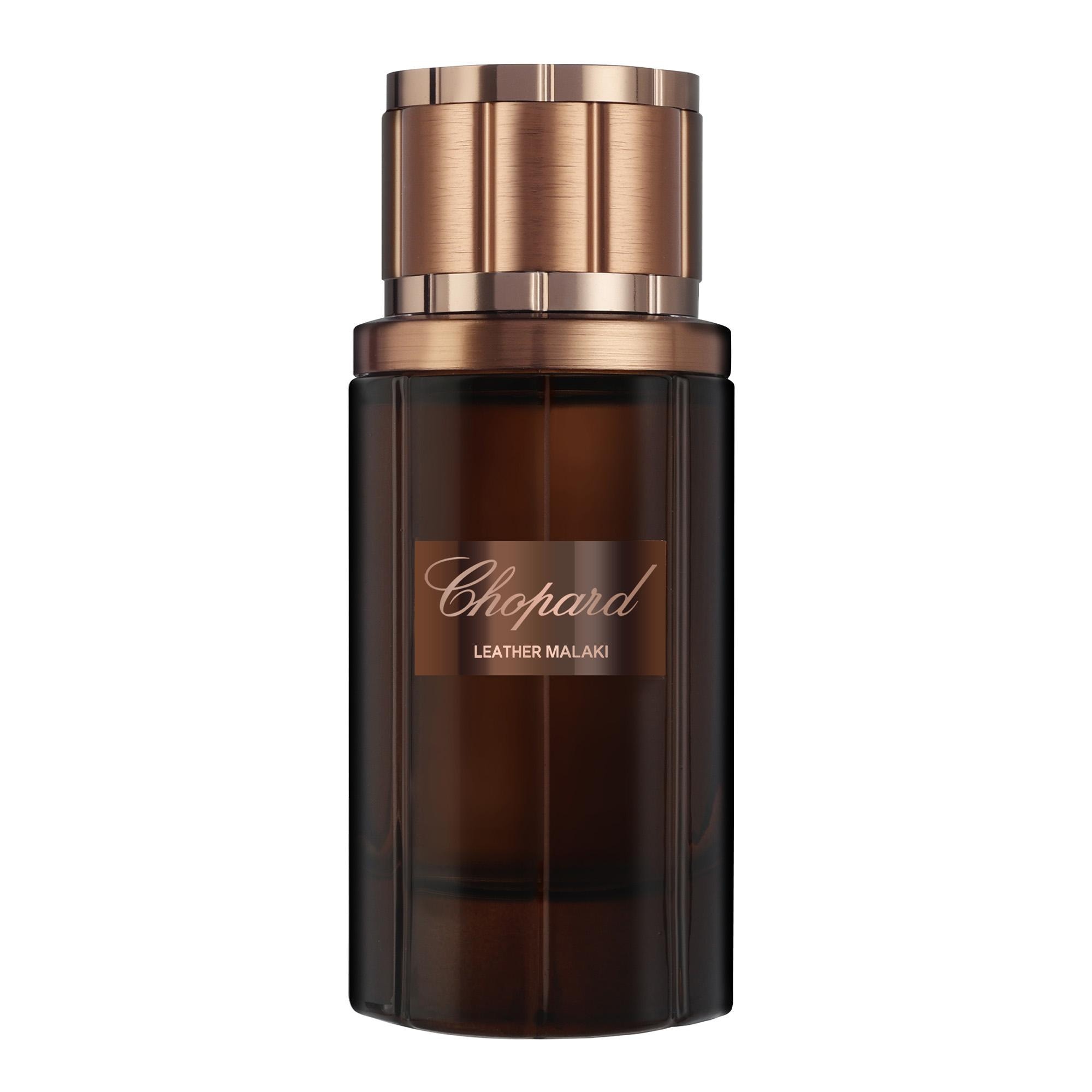Le flacon Leather Malaki, aux lignes graphiques et élancées, renfermant un jus brun à l'éclat doré, s'inspire des lumières enflammées du soleil couchant avec leurs reflets ambrés et cuivrés. Le capot, couleur cuivre, est un véritable travail d'orfèvre avec sa rondeur facettée, inspiré par les bracelets de montres Chopard.