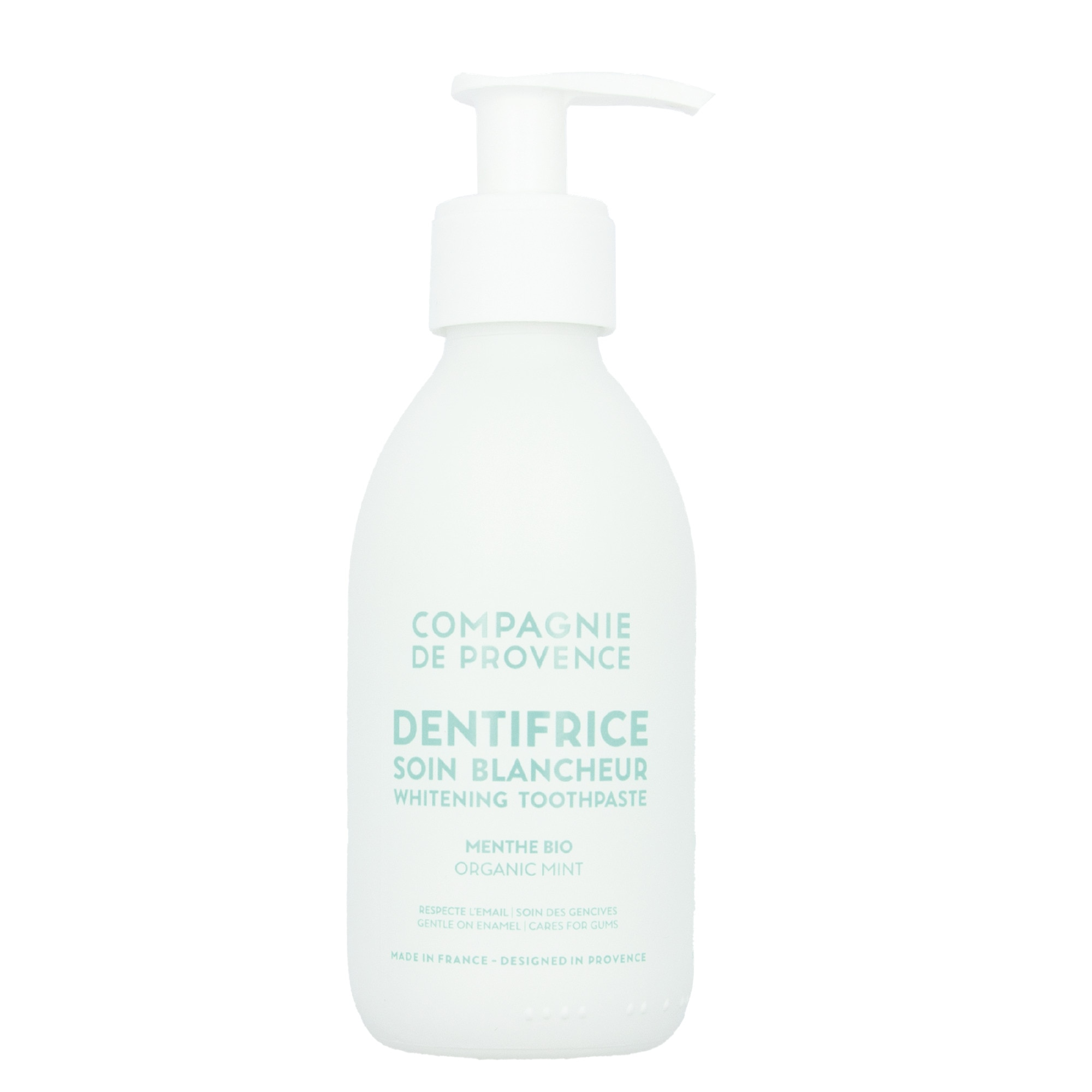 Ingrédients INCI : Aqua (Water), Hydrogenated Starch Hydrolysate, Glycerin**, Hydrated Silica, Hydroxyapatite, Xanthan Gum, Decyl Glucoside, Sodium Monofluorophosphate, Camellia Sinensis Leaf Water*, Camelina Sativa Seed Oil*, Stevia Rebaudiana Extract*, Aroma*, Mentha Piperita Oil*, Citric Acid, Sodium Benzoate, Potassium Sorbate, Limonene.