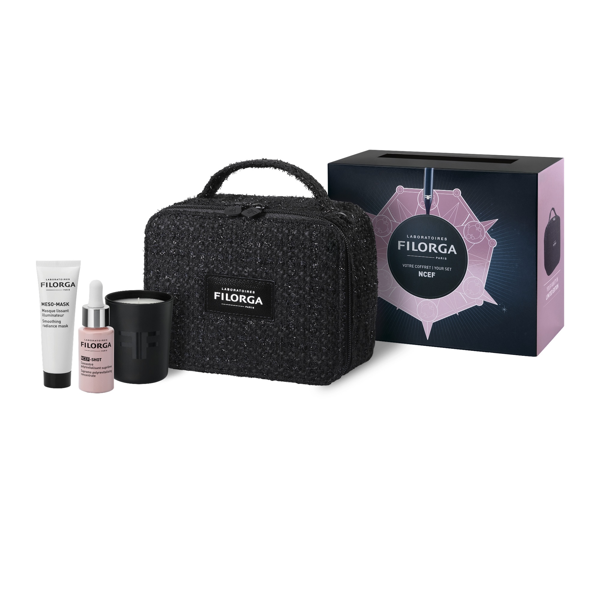 1 NCEF-SHOT sérum 15ml pour booster le renouvellement de votre peau en 10 jours* + 1 MESO-MASK 30ml, pour un effet illuminant instantané [offert] + 1 Bougie signature Filorga, pour parfumer délicatement votre intérieur [offert], le tout dans 1 beau Vanity en tweed, pour emporter vos chouchous Filorga partout [offert]