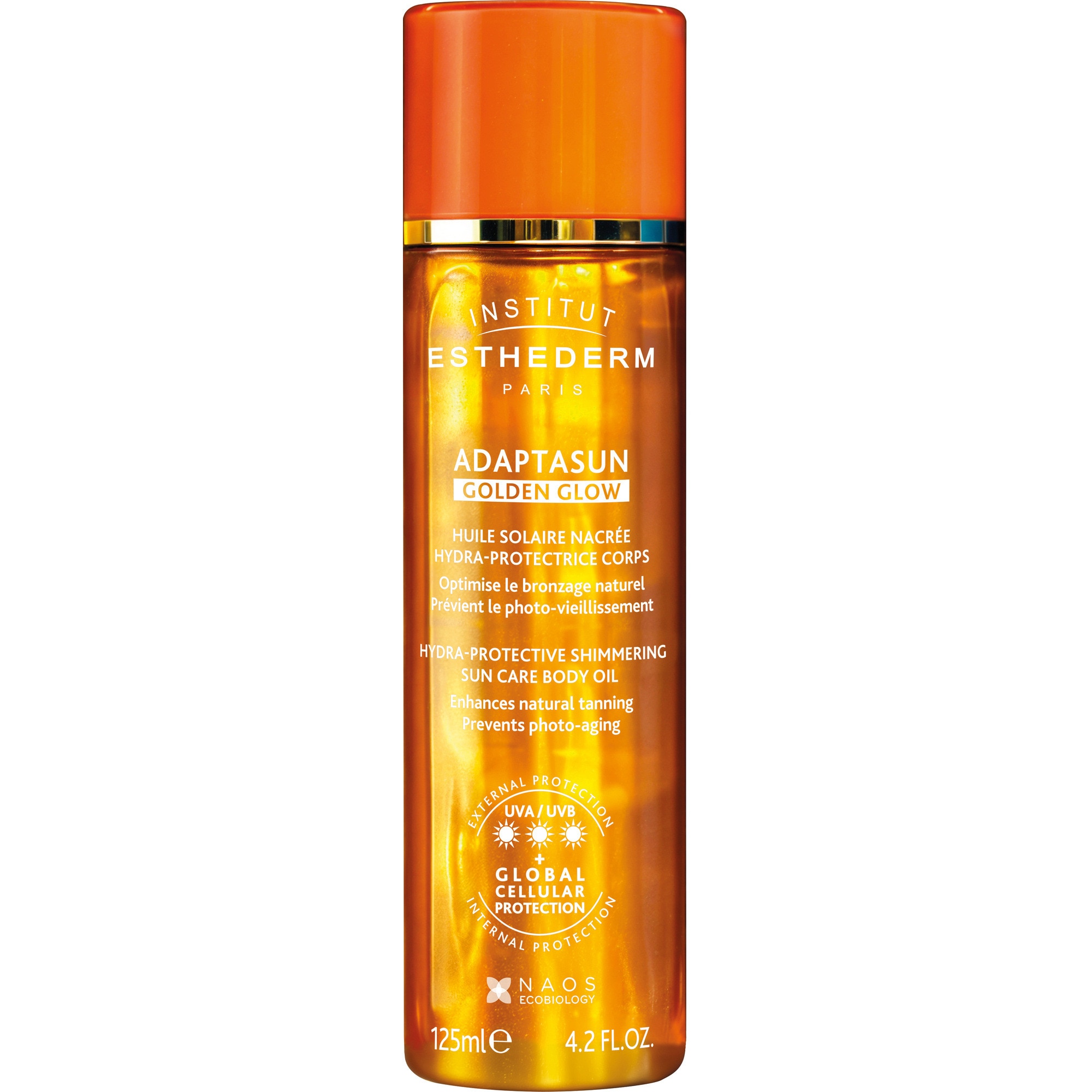 Adaptasun Golden Glow 125ml est une huile solaire nacrée haute protection pour le corps, idéale pour sublimer toutes les peaux, même sensibles ou intolérantes au soleil. Sa formule experte hydrate intensément, prévient le photo-vieillissement et optimise le bronzage naturel, tout en offrant un fini satiné lumineux grâce à ses nacres minérales. Sa texture légère illumine la peau dès l' application, révélant un effet doré naturel, et son parfum solaire emblématique procure une expérience sensorielle unique.